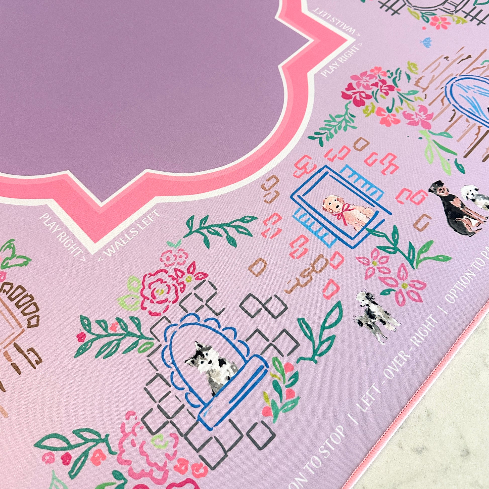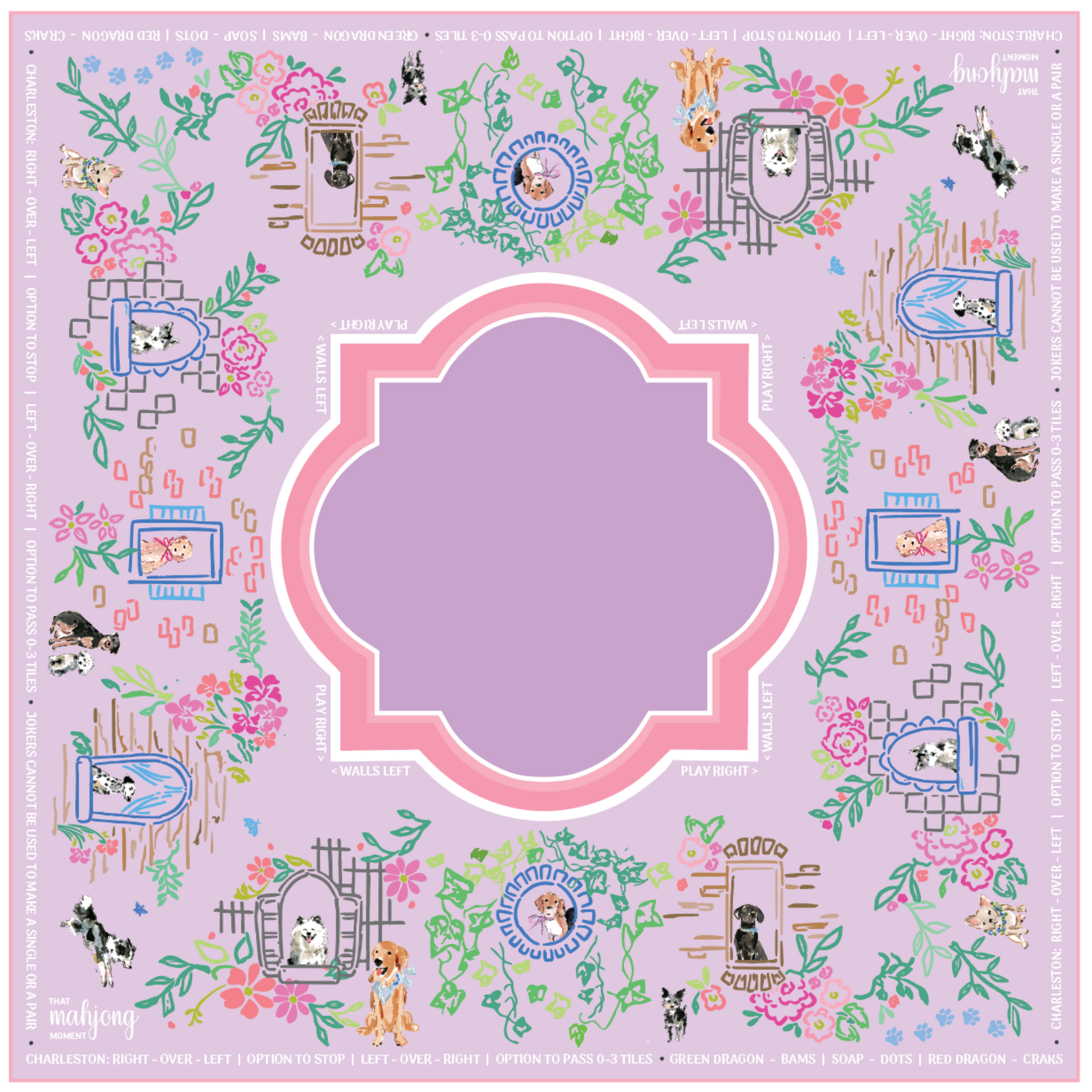 Paws up for a mat showcasing man’s best friends! Doggie in the Window features various breeds amongst English ivy and colorful flowers, peering out of windows and romping through the streets. Tiles are easy to spot during the game with a solid center medallion, and clear instructions along the edges offer gentle rule reminders.