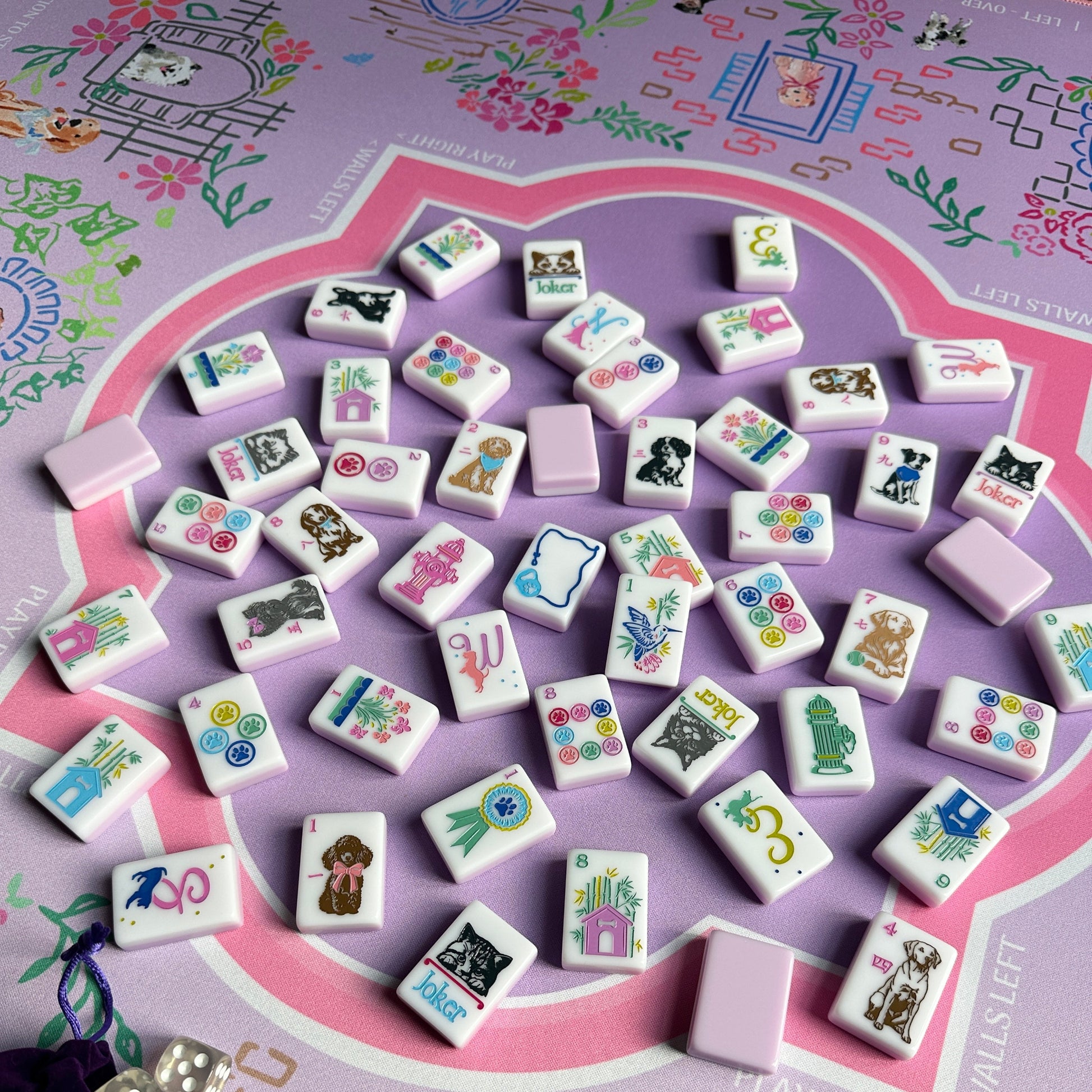 Paws up for a mat showcasing man’s best friends! Doggie in the Window features various breeds amongst English ivy and colorful flowers, peering out of windows and romping through the streets. Tiles are easy to spot during the game with a solid center medallion, and clear instructions along the edges offer gentle rule reminders.